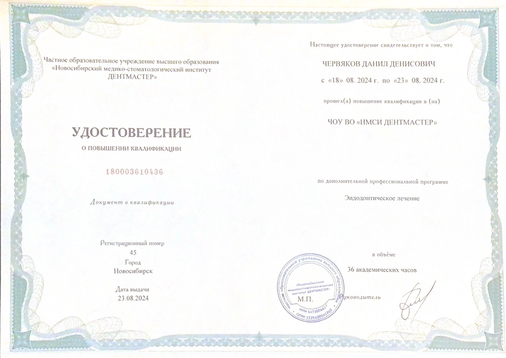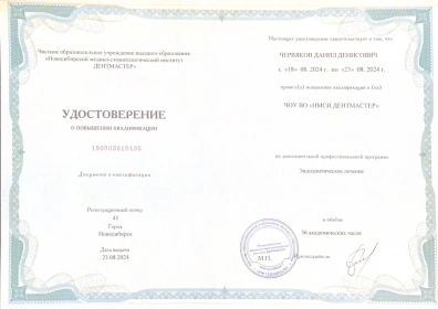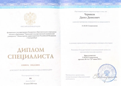 Данил Денисович окончил Уральский Государственнй Медицинский Университет по специальности «Стоматология» в 2024 году.