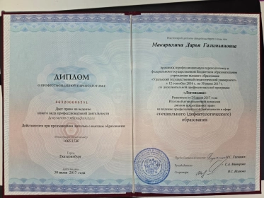 Дарья Галимьяновна — окончила Уральский государственный педагогический университет по специальности «Логопедия» в 2017 году.