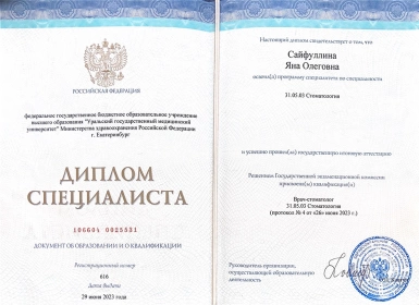 Яна Олеговна окончила Уральский Государственнй Медицинский Университет по специальности «Стоматология» в 2023 году.