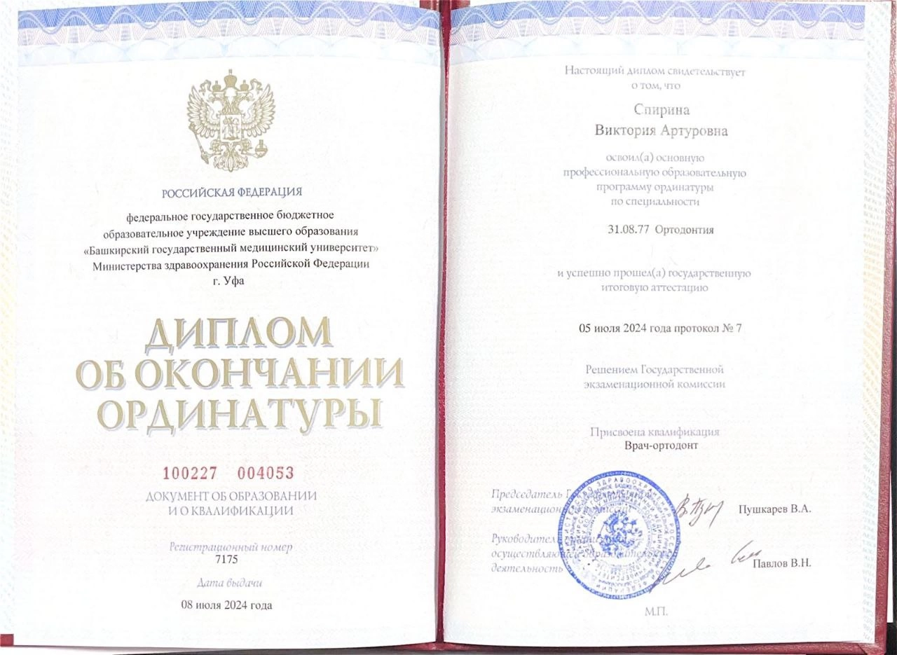 Виктория Артуровна окончила Пермский государственный медицинский университет имени академика Е.А. Вагнера по специальности «Стоматология» в 2020 г.